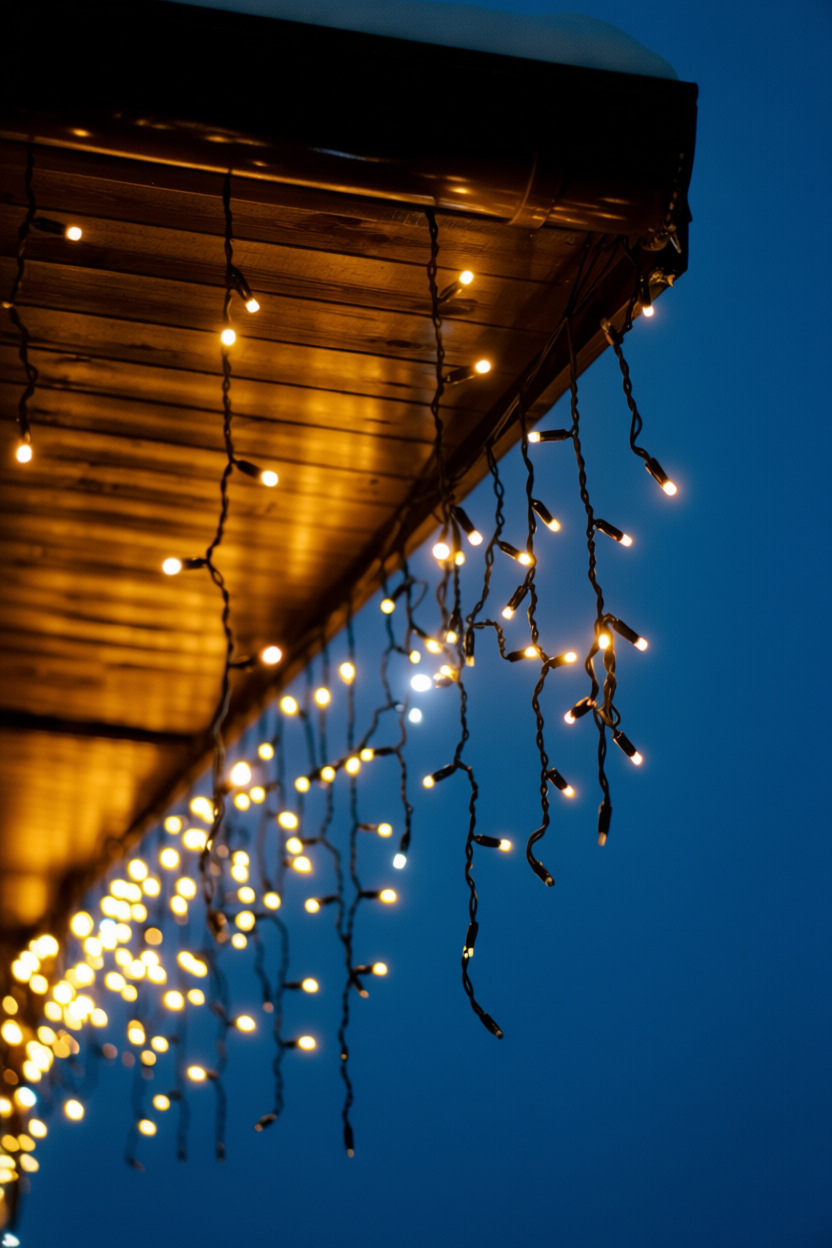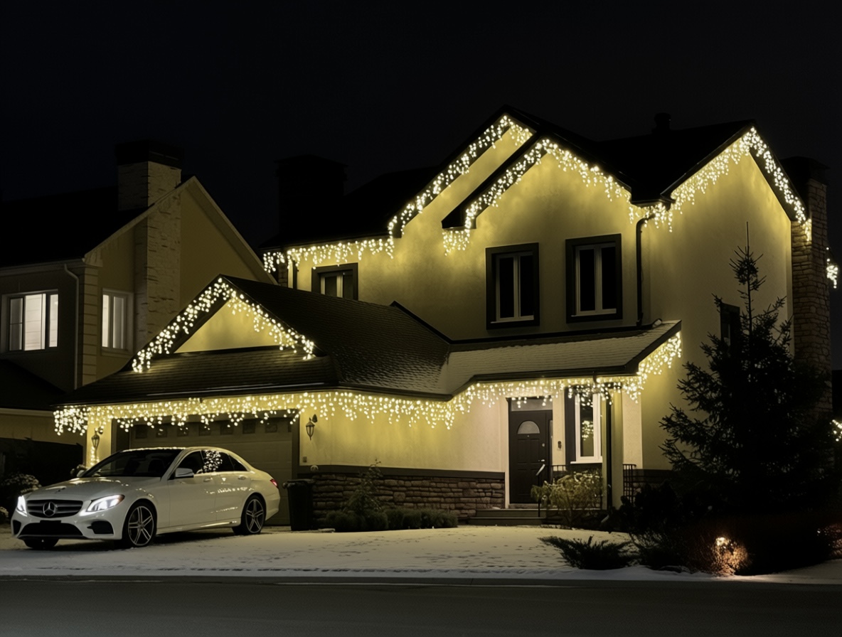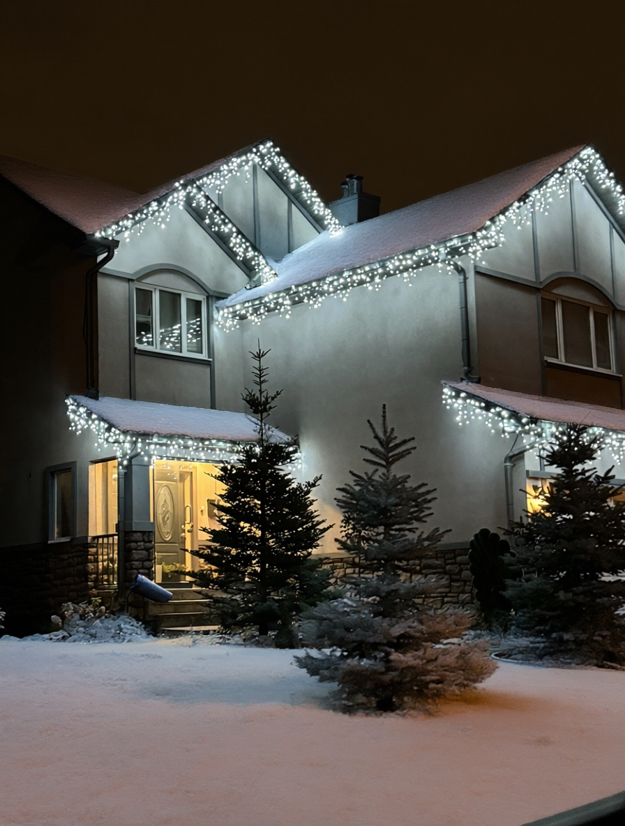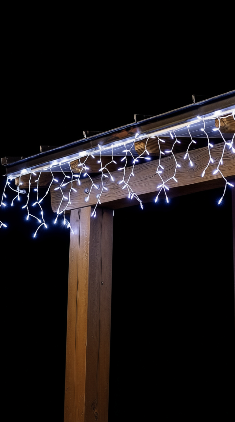 Гирлянда типа «бахрома» представляет собой тонкие нити светодиодов, прикрепленных горизонтально к одной общей шине питания. Чаще всего используется для вертикального декорирования окон, витрин, деревьев и арочных проемов.